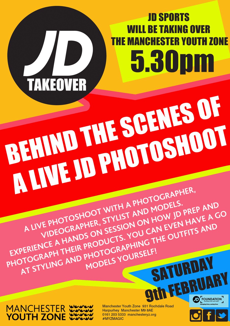 “JD Sports run a monthly “Takeover” event at the Youth Zone, and this Saturday they will be running a hands-on workshop, Behind the Scenes of a photoshoot, demonstrating how they prepare and shoot products for catalogues and their online store!”
