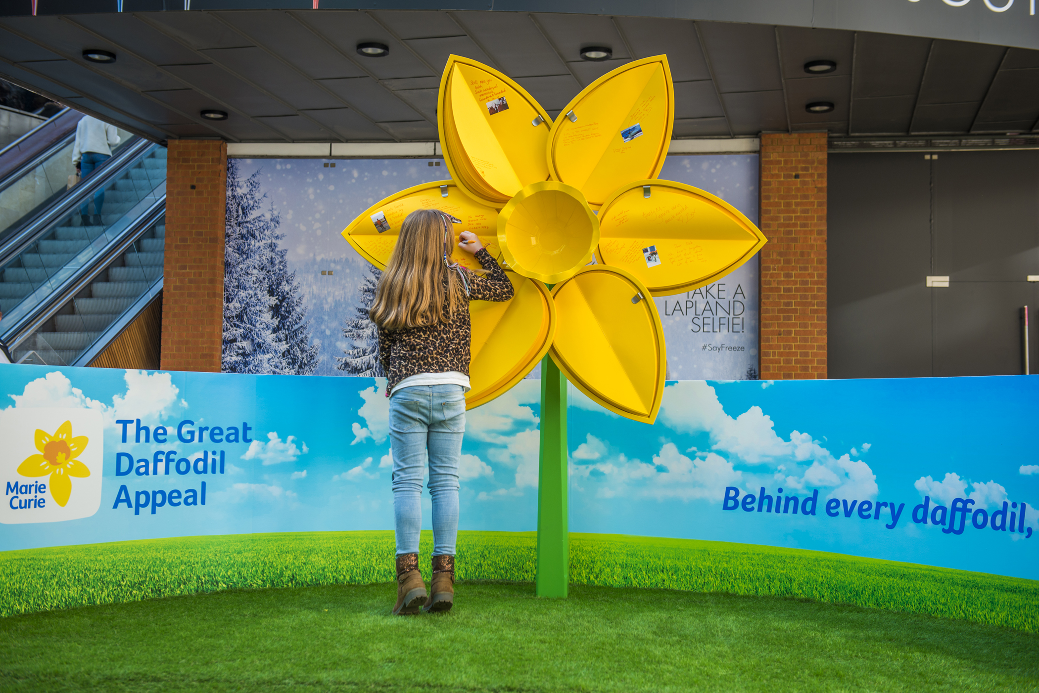 At the Great Big Daffodil people can take a moment to reflect, remember and pay tribute to those who have been special to them. They can write something or add a photo into the paper books within each petal or speak to one of the Marie Curie team.
