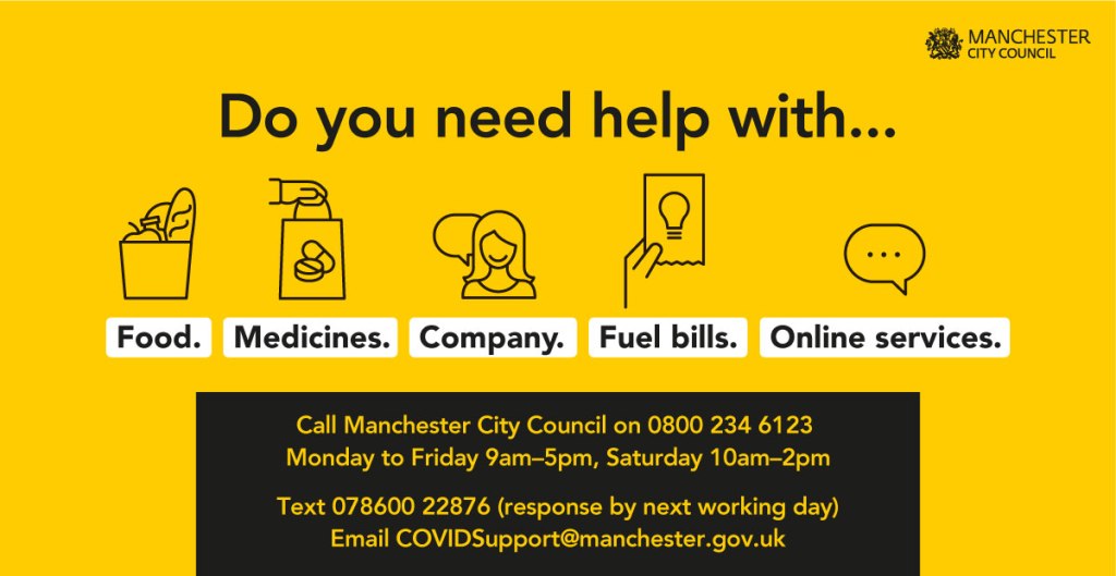 If you need help freephone: 0800 234 6123 email: COVIDSupport@manchester.gov.uk or text: 078600 22876 (messages responded to by the next working day) or visit http://www.manchester.gov.uk/coronavirus