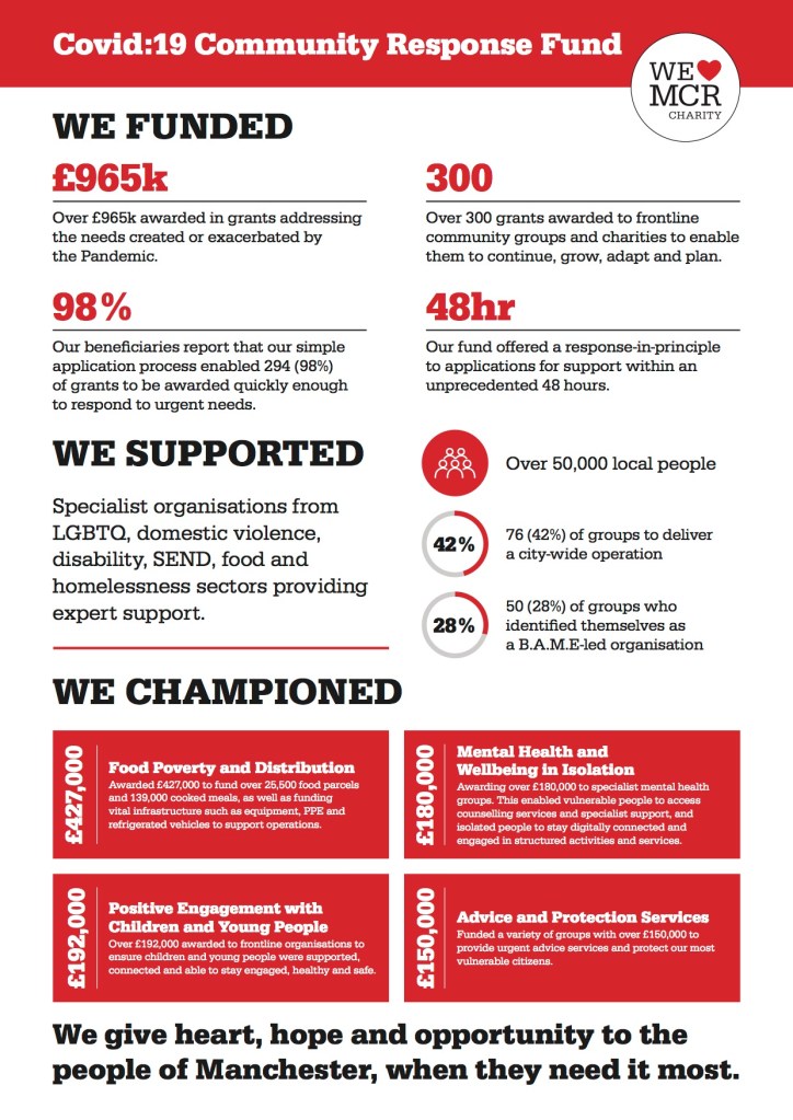 “We’ve been able to compile this report thanks to all those organisations which filled in our survey – thank you for taking the time to tell us how the Fund has supported you and your communities” writes Marie O’Neill-Steinegger, We Love MCR Charity / IDVA Team.