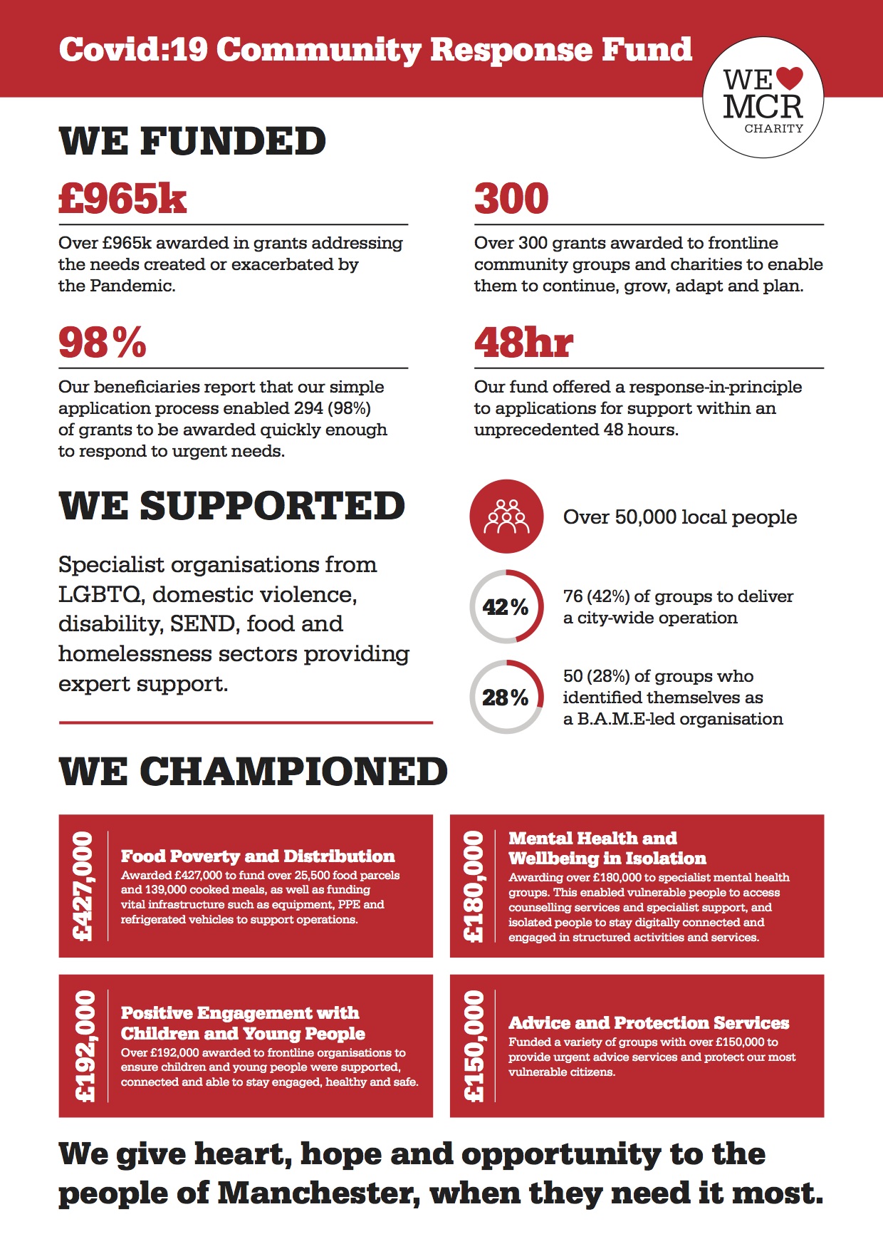 “We’ve been able to compile this report thanks to all those organisations which filled in our survey – thank you for taking the time to tell us how the Fund has supported you and your communities” writes Marie O’Neill-Steinegger, We Love MCR Charity / IDVA Team.