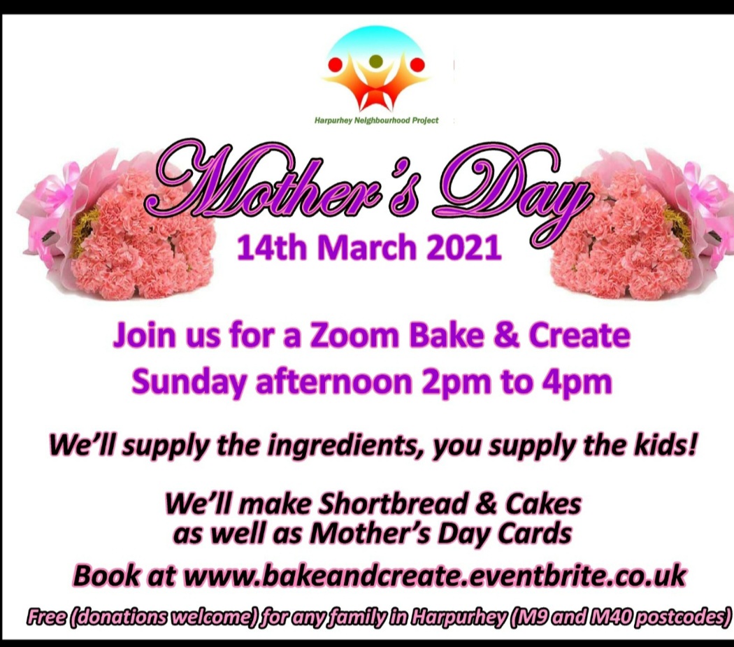 Harpurhey Neighbourhood Project is organising a Mother’s Day Bake and Create Zoom event on Sunday 14th March from 2pm until 4pm.