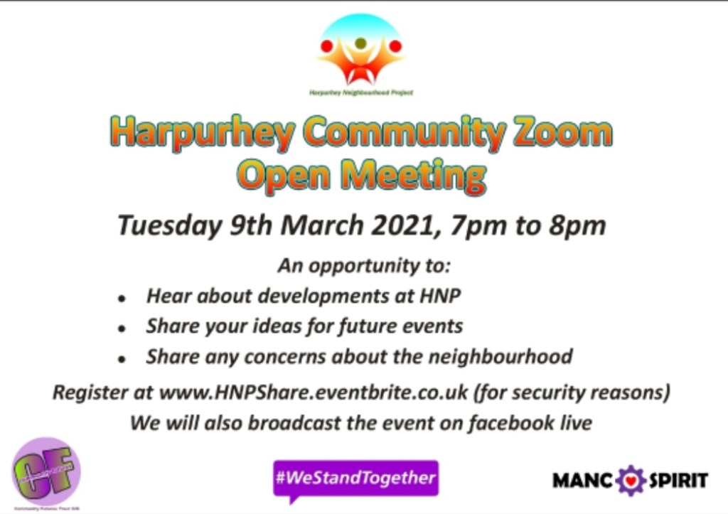 Harpurhey Neighbourhood Project, home of North Manchester FM 106.6, is hosting a Harpurhey Community Zoom Open Meeting on Tuesday 9th March from 7pm until 8pm.