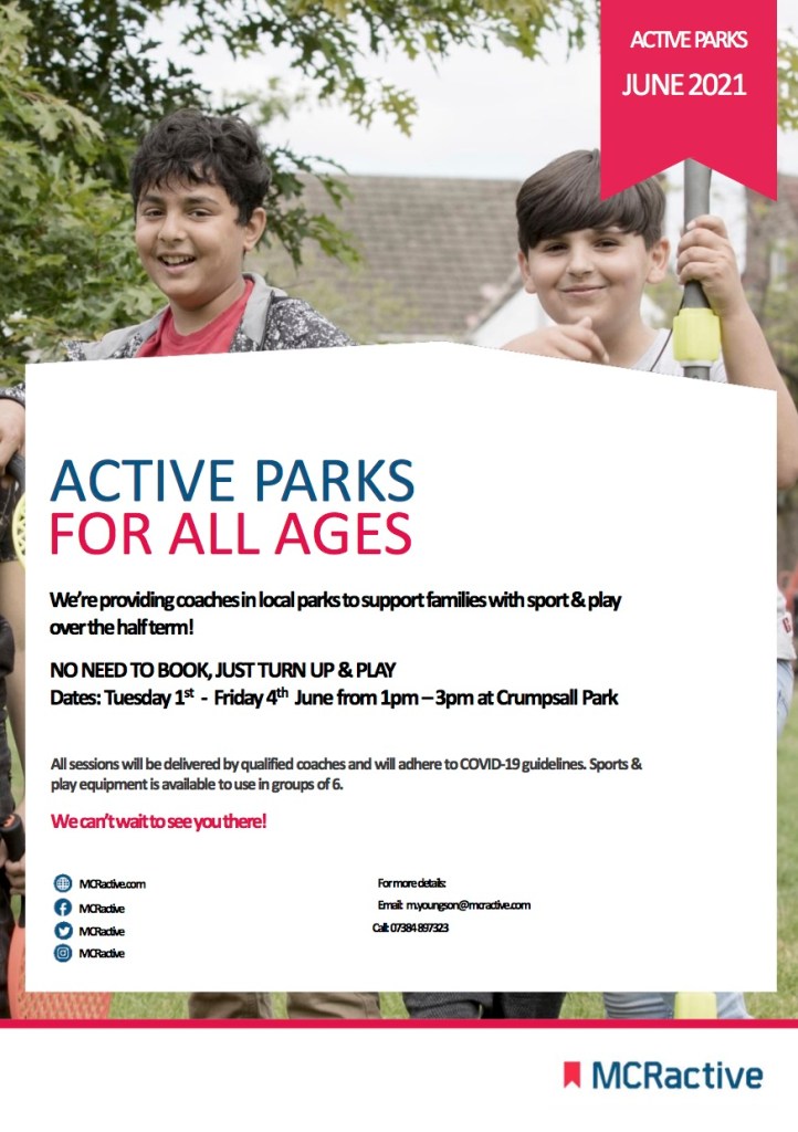 May 20, 2021 nmfm1066 Activity: MCRactive Active Parks for All Ages at Crumpsall Park MCRactive are providing coaches in local parks to support families with sport & play over the half term! This is for all ages and no need to book just turn up and play. Dates: Tuesday 1st to Friday 4th June from 1pm-3pm at Crumpsall Park. Share this: Share on X (Opens in new window) X Share on Facebook (Opens in new window) Facebook Like Loading... Related