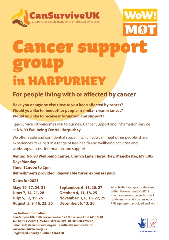 “As we hopefully come out of lockdown, we have reintroduced our weekly cancer support group – which takes place Mondays, 1p to 3pm at No. 93 Wellbeing Centre” writes Marcella Turner, Chief Executive Officer of CanSurviveUK.