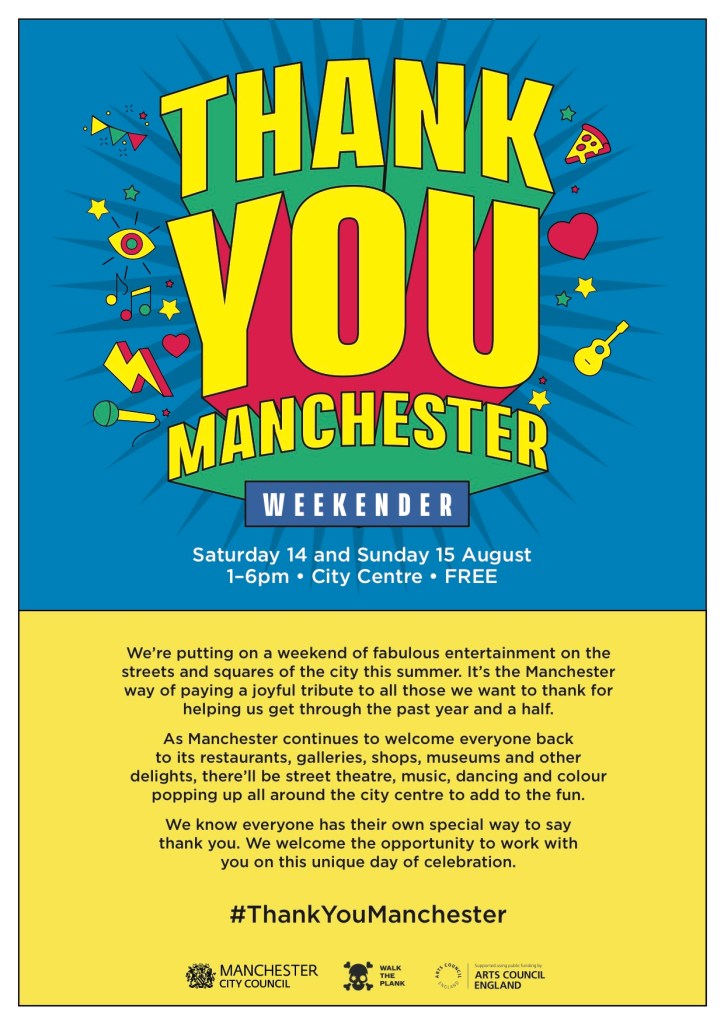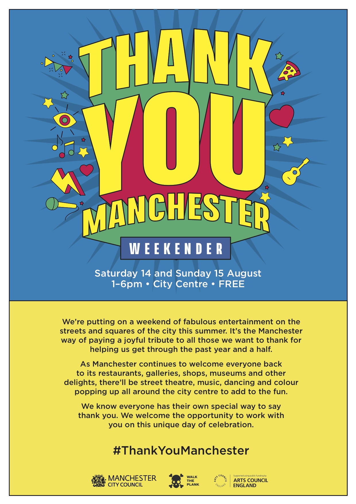 We’re putting on a weekend of fabulous entertainment on the streets and in the squares of the city this summer. It’s the Manchester way of making a joyful tribute to all those we want to thank for helping us get through the past year and a half.