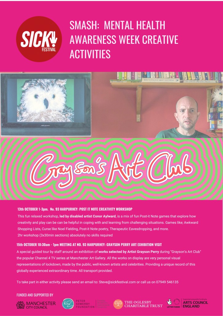 This fun relaxed workshop, led by disabled artist Conor Aylward, is a mix of fun Post-it Note games that explore how creativity and play can be can be helpful in coping with and learning from challenging situations. Games like; Awkward Shopping Lists, Curse like Noel Fielding, Post-it Note poetry, Therapeutic Eavesdropping, and more.