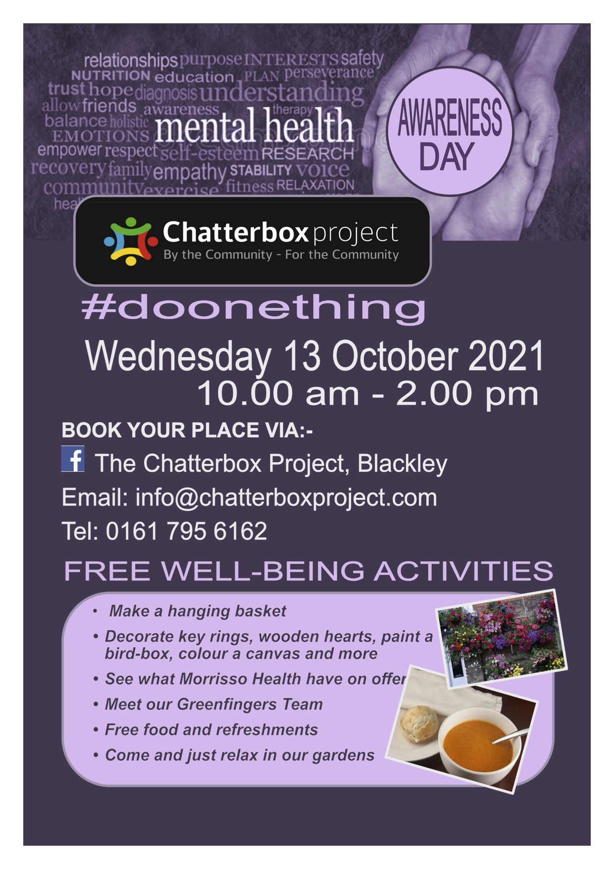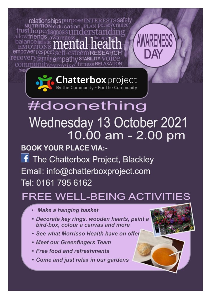 October 12, 2021October 11, 2021 nmfm1066 Get Involved: Chatterbox #DoOneThing Wednesday 13th October 10am-2pm Free wellbeing activities with Chatterbox Share this: Share on X (Opens in new window) X Share on Facebook (Opens in new window) Facebook Like Loading... Related