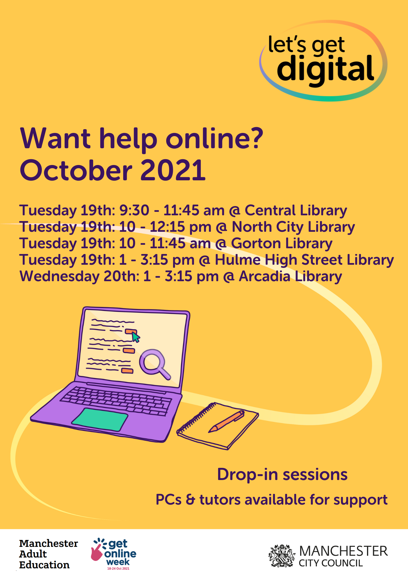 Manchester Adult Education Service (MAES) teachers will be there to help anyone get online and talk about MAES courses, and the MCC Digital Inclusion team will offer advice on how to access devices, data and training.