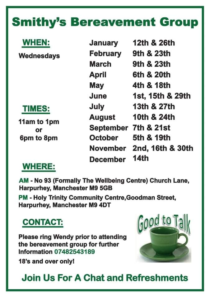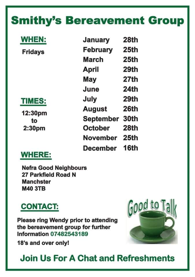 January 18, 2022 nmfm1066 Support: Smithy’s Bereavement Group Smithy’s Breavement Group: Dates, times and venues below! Please ring Wendy prior to attending the bereavement group for further information on 074825 43189. 18 and over only! Share this: Share on X (Opens in new window) X Share on Facebook (Opens in new window) Facebook Like Loading... Related