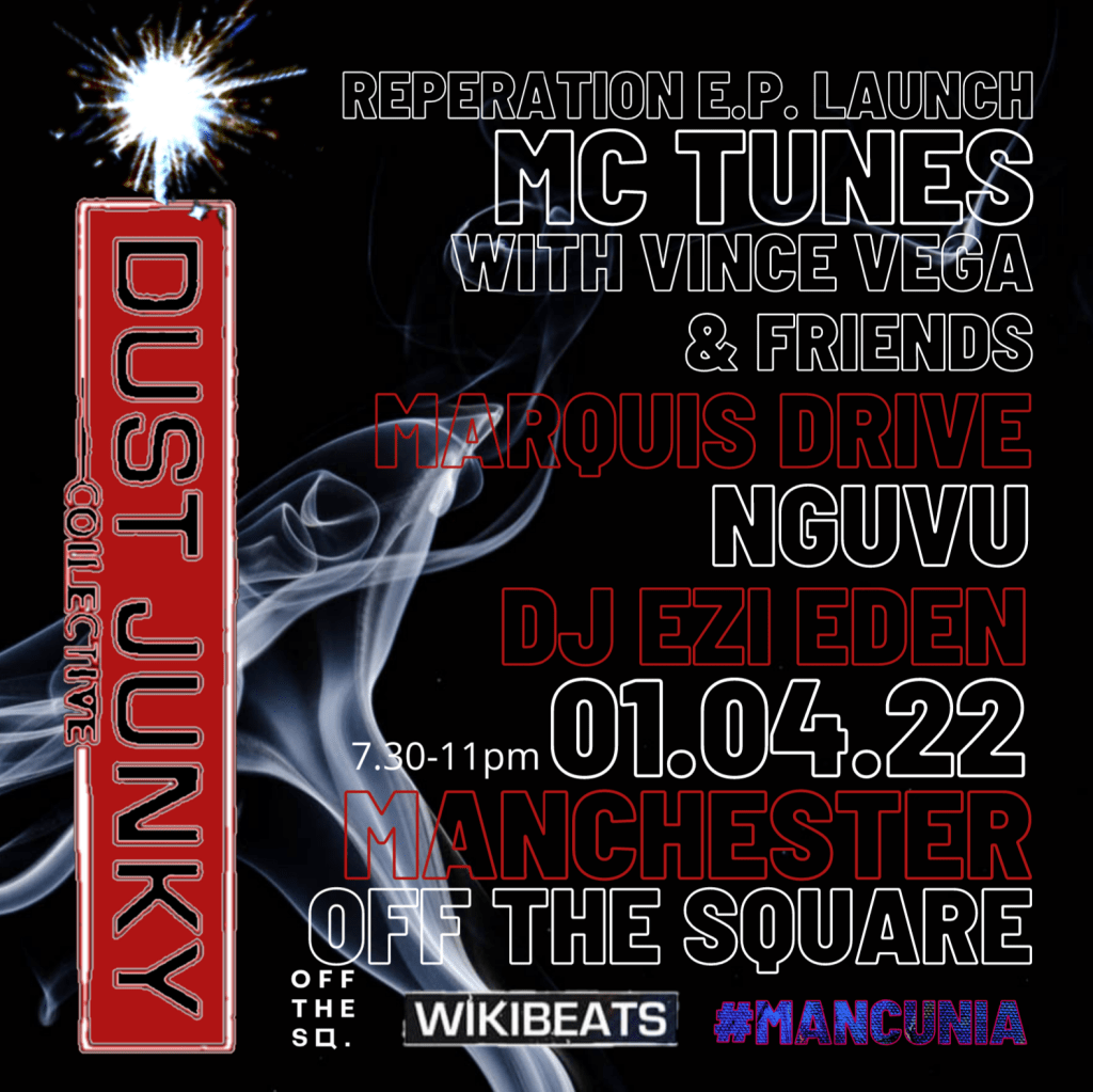 MC Tunes is a regular guest on Kierno’s From Manchester With Love show and he is launching his Dust Junky Collective Reparation EP with a gig at Off The Square in central Manchester.