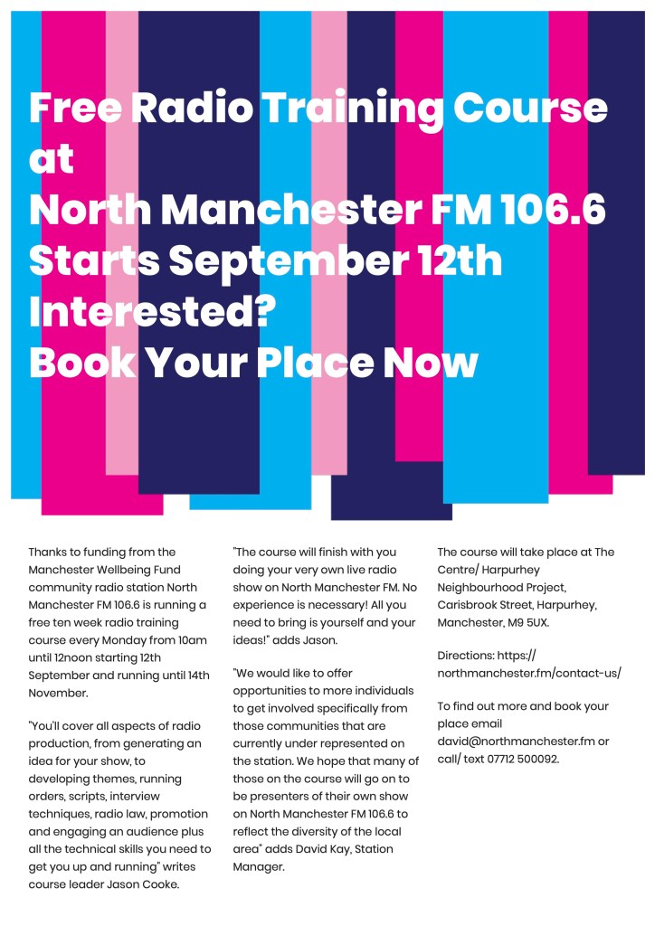 Thanks to funding from the Manchester Wellbeing Fund community radio station North Manchester FM 106.6 is running a free ten week radio training course every Monday from 10am until 12noon starting 12th September and running until 14th November.