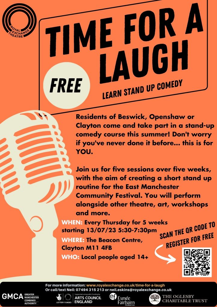 July 11, 2023 nmfm1066 Free Comedy Workshops for residents of Beswick, Openshaw or Clayton Scan the QR code on the poster above to register for free – or follow this link for more information. Share this: Click to share on X (Opens in new window) X Click to share on Facebook (Opens in new window) Facebook Like Loading... Related