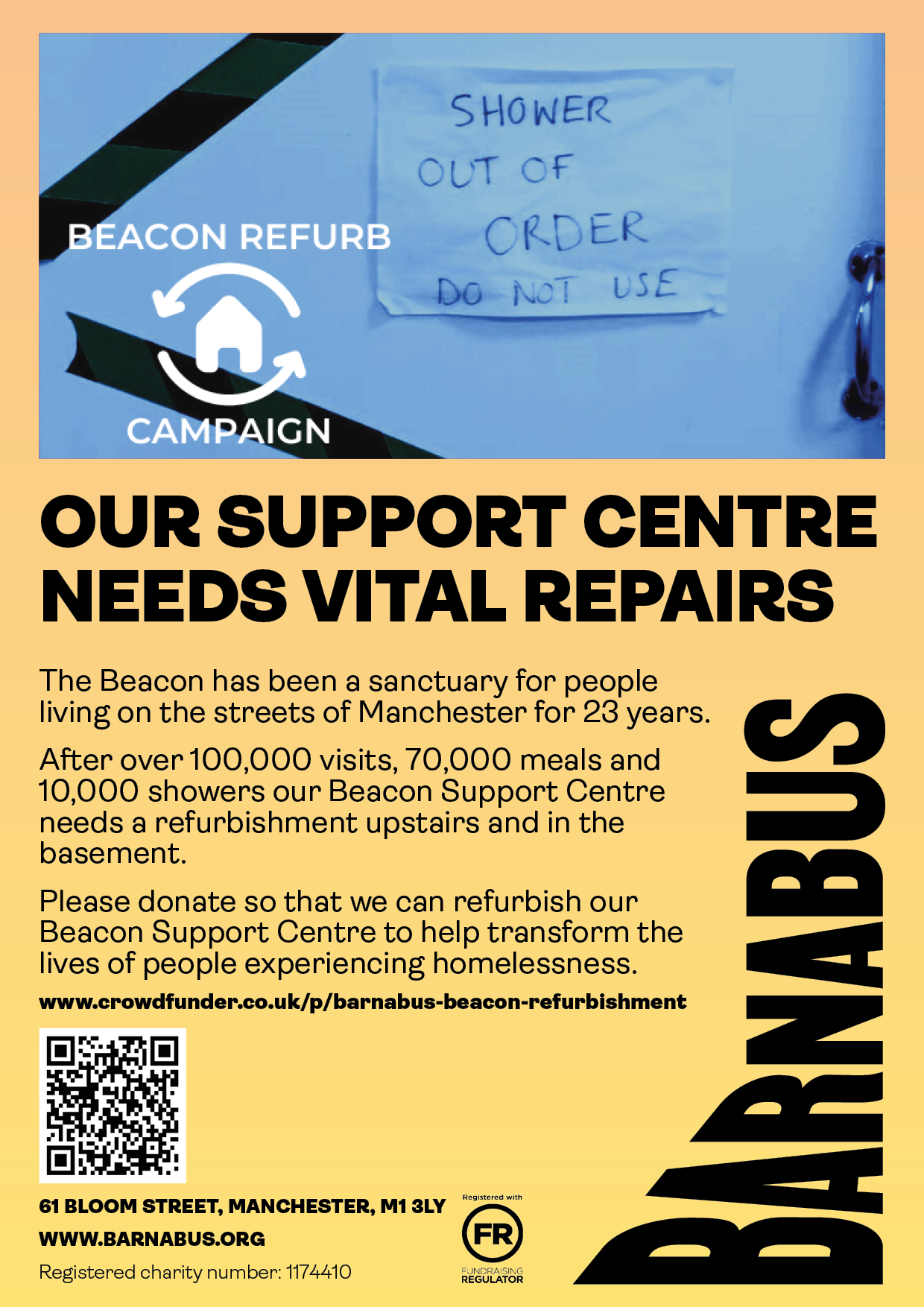 Barnabus is a Christian Homeless Charity in Manchester bringing hope and transformation to people experiencing homelessness and rough sleeping in our City for over 30 years. They focus on recovery; through person centred and trauma informed support. Working together with those, they seek to break the cycle of homelessness, releasing men and women from poverty, trauma and the effects of homelessness. They do this through their Support Team, Beacon Support Centre, Healthcare, Resettlement Tenancy Programme and their own Supported Housing.