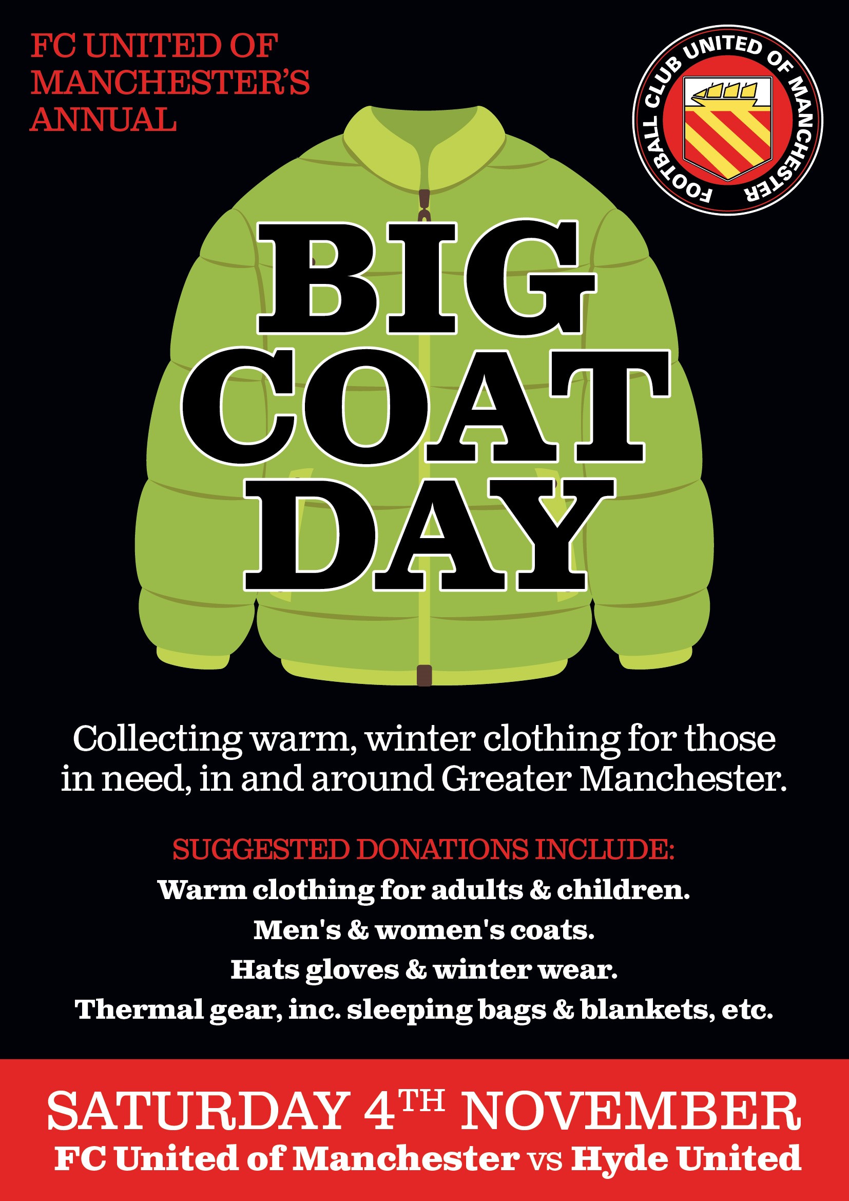 Big Coat Day is FC United’s annual collection of coats and warm winter clothing to help those in need across Greater Manchester and this year it will take place on Saturday 4th November at Broadhurst Park prior to FC’s match against Hyde United.