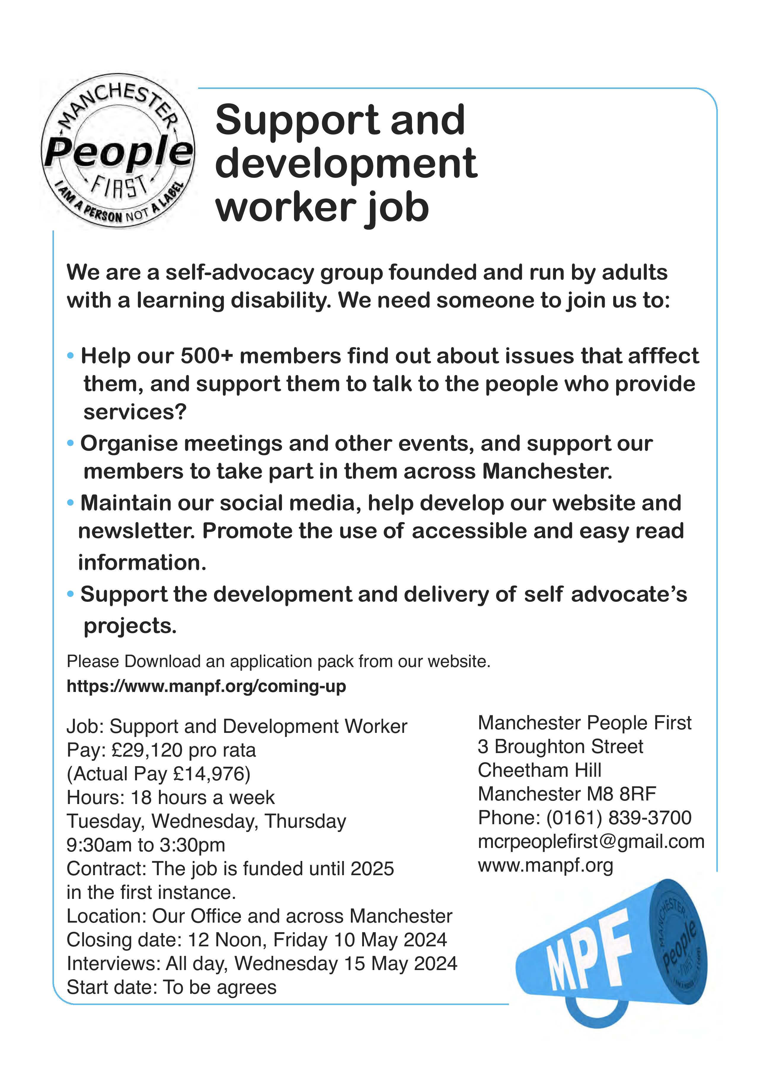 April 16, 2024April 16, 2024 nmfm1066 Support & Development Worker Job at Manchester People First Click here to download the Advertisement, Job Description, Person Specification and Application FormNB: You’ll need to download the documents, they cannot be filled in online, or find out more here. Share this: Click to share on X (Opens in new window) X Click to share on Facebook (Opens in new window) Facebook Like Loading... Related