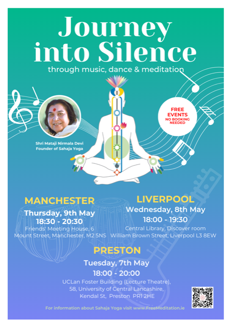 Join a free Wellbeing Event taking place in Manchester on Thursday 9th May at 6.30pm. The programme includes Live music, Dance with Qawwalis, Live Sitar and Tabla and a Self-Realisation Experience and Workshop session on Meditation.