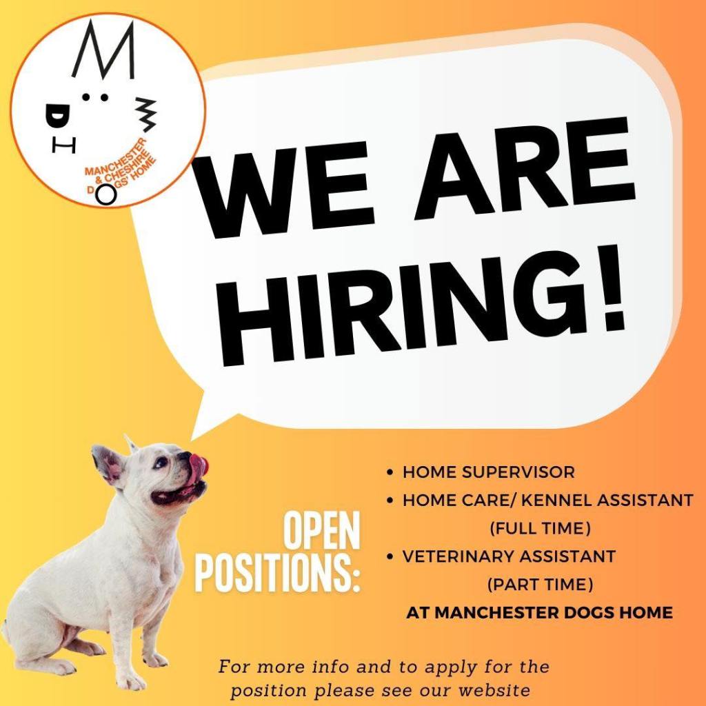 Manchester Dog’s Home are hiring. They have positions for Veterinary Assistant (Part time) and Home Supervisor, Home Care / Kennel Assistant at Manchester Dogs Home (Full Time) – Permanent Contract.