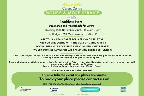 On Thursday, Manchester Carers are hosting a Money & More Roadshow event at Bridge 5 Mill – you need to book in advance for this, but Manchester Carers . We spoke to Nina about the support they can offer unpaid carers in Manchester, which has increased since they set up a North Manchester Team in May. We chat about the support on offer and how it can help reduce feelings of isolation.