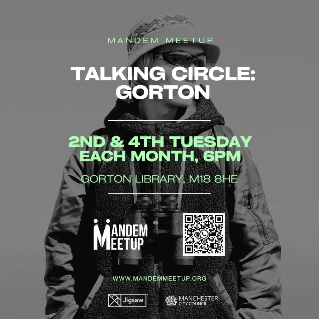 Mandem Meetup launches a brand new Talking Circle in Gorton tomorrow, and then running on the 2nd and 4th Tuesday at Gorton Library each month at 6pm. Free to attend!