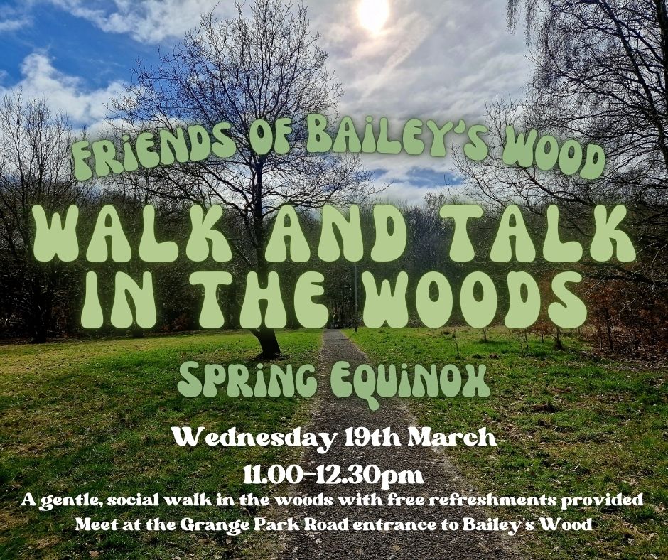 Join us next Wednesday, 11-12.30pm, for our Walk and Talk in the Woods. The next walk will have a Spring Equinox theme… so meet us at the Grange Park Road entrance to enjoying the changing seasons in Bailey’s Wood!